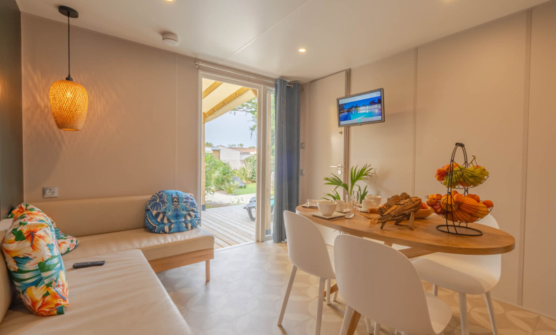 Ein Wohnzimmer mit Essbereich. Heizung in allen Räumen. Flachbildfernseher und Wifi.