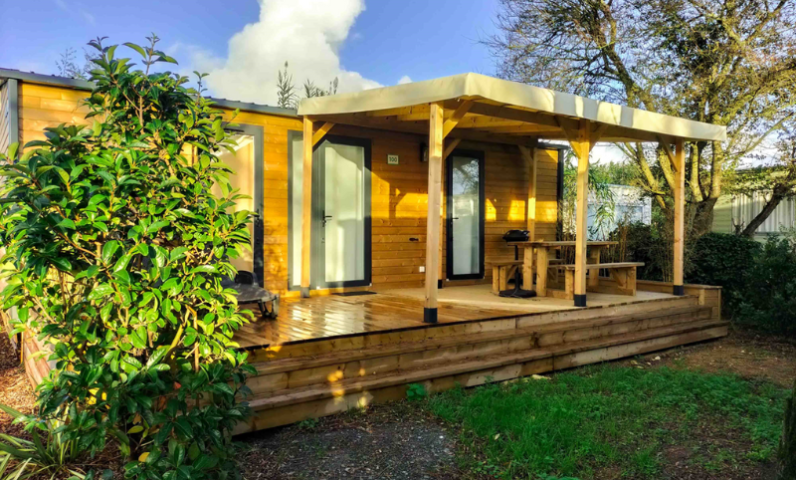 Überdachte Holzterrasse von 15 m2 mit Gartenmöbeln inklusive 1 Tisch, 2 Bänken und 2 Liegestühlen. Landschaftlich gestaltetes Grundstück.