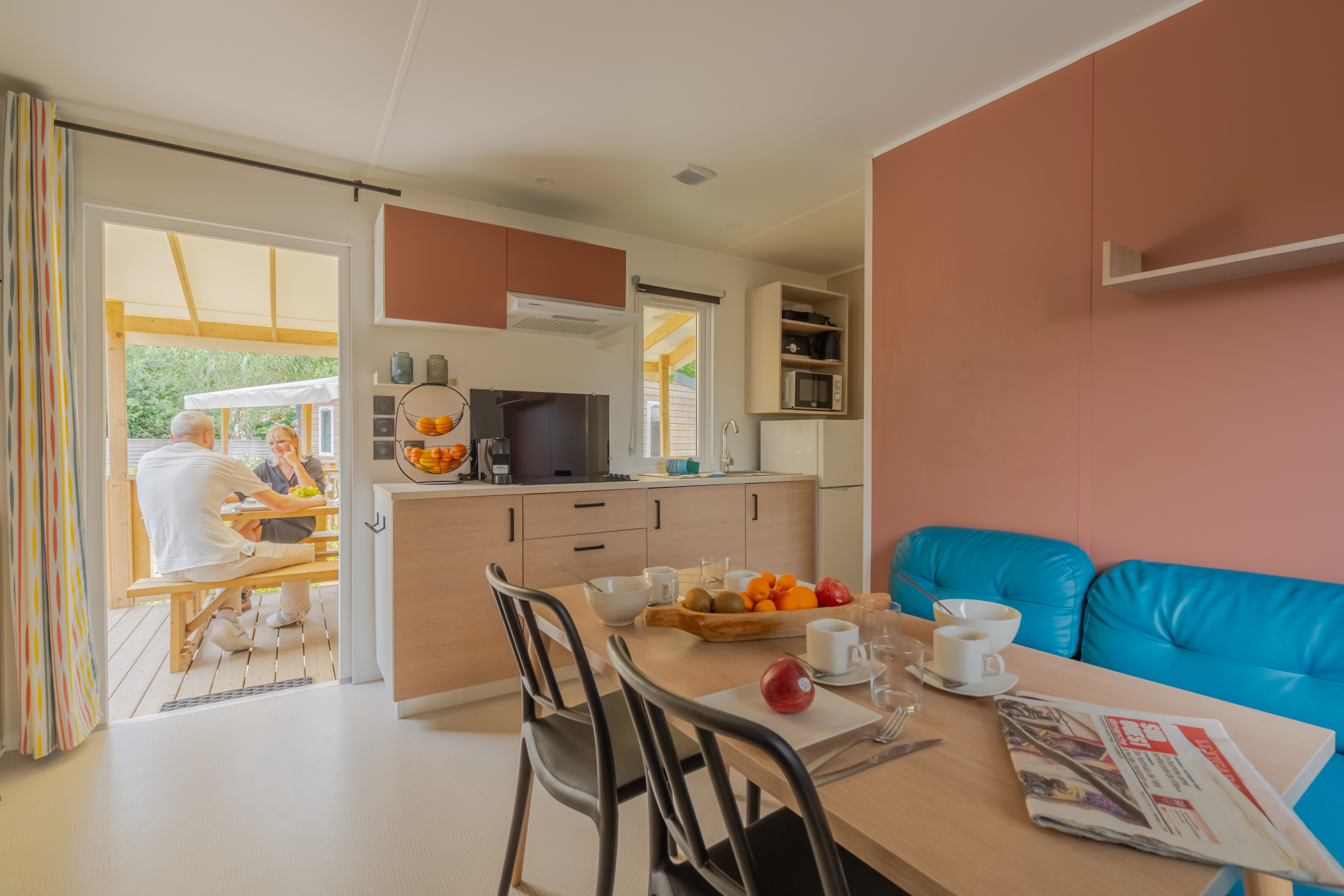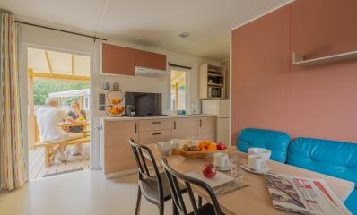 Schlafzimmer: 1 Schlafzimmer mit einem großen Doppelbett (140 x 190 cm). 1 Schlafzimmer mit 2 Einzelbetten 80 x 190 cm. Wohnzimmer: 1 Schlafcouch für 2 Personen (120 x 190 cm). Bettdecken und Kopfkissen werden gestellt. Bettwäsche und Handtücher werden nicht gestellt. Küche mit Elektroherd, Kühlschrank mit Gefrierfach, Abzugshaube, Mikrowelle, Espressokocher mit Kapseln, Zitruspresse, Toaster, Wasserkocher, Besteck für Meeresfrüchte, Geschirr und Küchenutensilien. Ein Badezimmer mit Dusche und Waschbecken. Separates WC, Heizung in allen Räumen, Bereitstellung von Wasser und Strom. Fernseher und 1 WLAN-Anschluss inbegriffen. Halbüberdachte Holzterrasse von 15 m2 mit Gartenmöbeln, bestehend aus 1 Tisch, 2 Bänken und 2 Liegestühlen. Angelegtes Grundstück. Nicht vertragliche Fotos