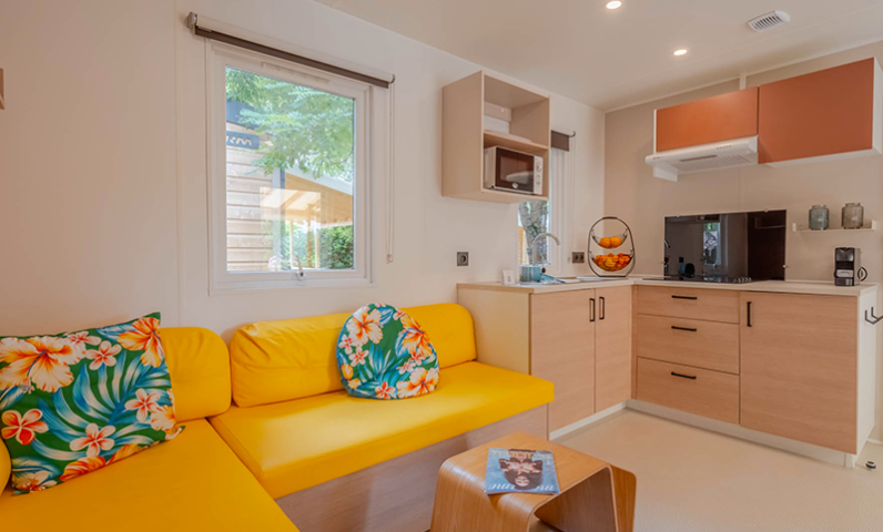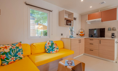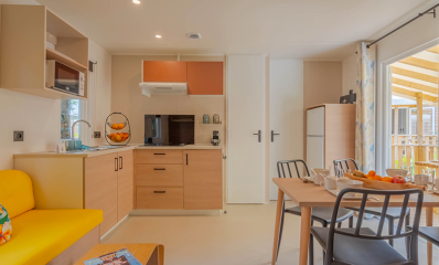 Equipped kitchen with electric hob, fridge-freezer, extractor hood, microwave, espresso capsule coffee maker, citrus press, toaster, kettle, seafood cutlery, crockery and kitchen utensils.