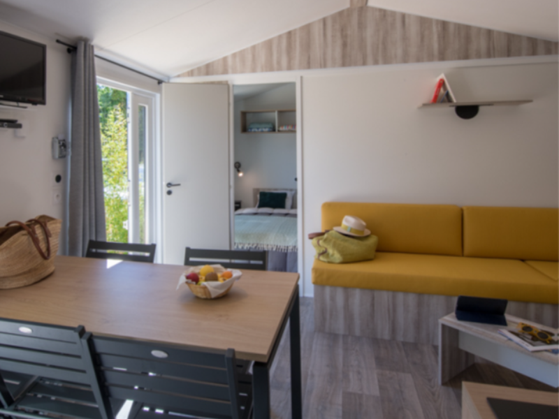 The cottage Prestige 3 bedrooms 2 bathrooms has a surface of 36 36 m² for 6 to 8 persons. Bedrooms: 1 bedroom with 1 double bed 160 x 190 cm and ensuite bathroom with shower and toilet. 2 bedrooms with 2 single beds 80 x 190 cm. Living room: 1 x 120 x 190 cm 2-seater sofa-bed. Comforters and pillows supplied. Sheets and household linen not provided. Fully-equipped kitchen with induction hob, fridge-freezer, extractor fan, microwave, Nespresso capsule coffee maker, juicer, toaster, kettle, seafood cutlery, crockery and kitchen utensils. A further shower room with shower and washbasin. Separate WC. Heating in all rooms, water and electricity included. Television included. 1 Wifi connection included. 15 M2 covered wooden terrace with garden furniture including 1 table, 2 benches and 2 deckchairs. Non contractual photos.
