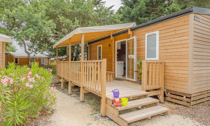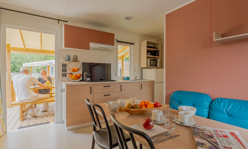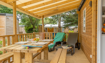 15 m2 semi-covered wooden terrace with garden furniture including 1 table, 2 benches and 2 deckchairs.