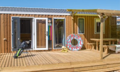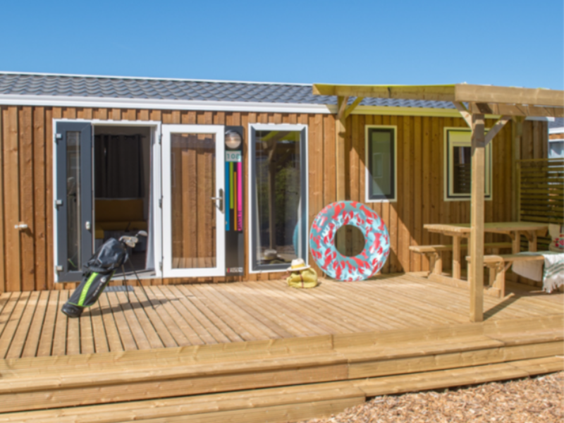 The cottage Prestige 3 bedrooms 2 bathrooms has a surface of 36 36 m² for 6 to 8 persons. Bedrooms: 1 bedroom with 1 double bed 160 x 190 cm and ensuite bathroom with shower and toilet. 2 bedrooms with 2 single beds 80 x 190 cm. Living room: 1 x 120 x 190 cm 2-seater sofa-bed. Comforters and pillows supplied. Sheets and household linen not provided. Fully-equipped kitchen with induction hob, fridge-freezer, extractor fan, microwave, Nespresso capsule coffee maker, juicer, toaster, kettle, seafood cutlery, crockery and kitchen utensils. A further shower room with shower and washbasin. Separate WC. Heating in all rooms, water and electricity included. Television included. 1 Wifi connection included. 15 M2 covered wooden terrace with garden furniture including 1 table, 2 benches and 2 deckchairs. Non contractual photos.