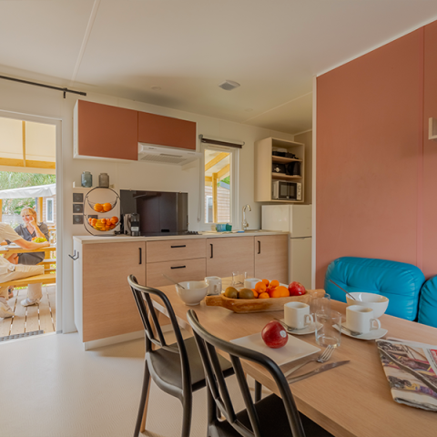 - Cottage Privilège con 3 habitaciones y 2 baños, para 6-8 personas Este alquiler de 36 m² es perfecto para una estancia de última hora en familia o con amigos. Los espacios habitables son cómodos, con un salón amplio, una terraza con vistas impresionantes al mar cercano y un salón de jardín amueblado. Los campistas también tienen acceso a diversos equipos de cocina, como la placa de inducción, la nevera o el congelador.