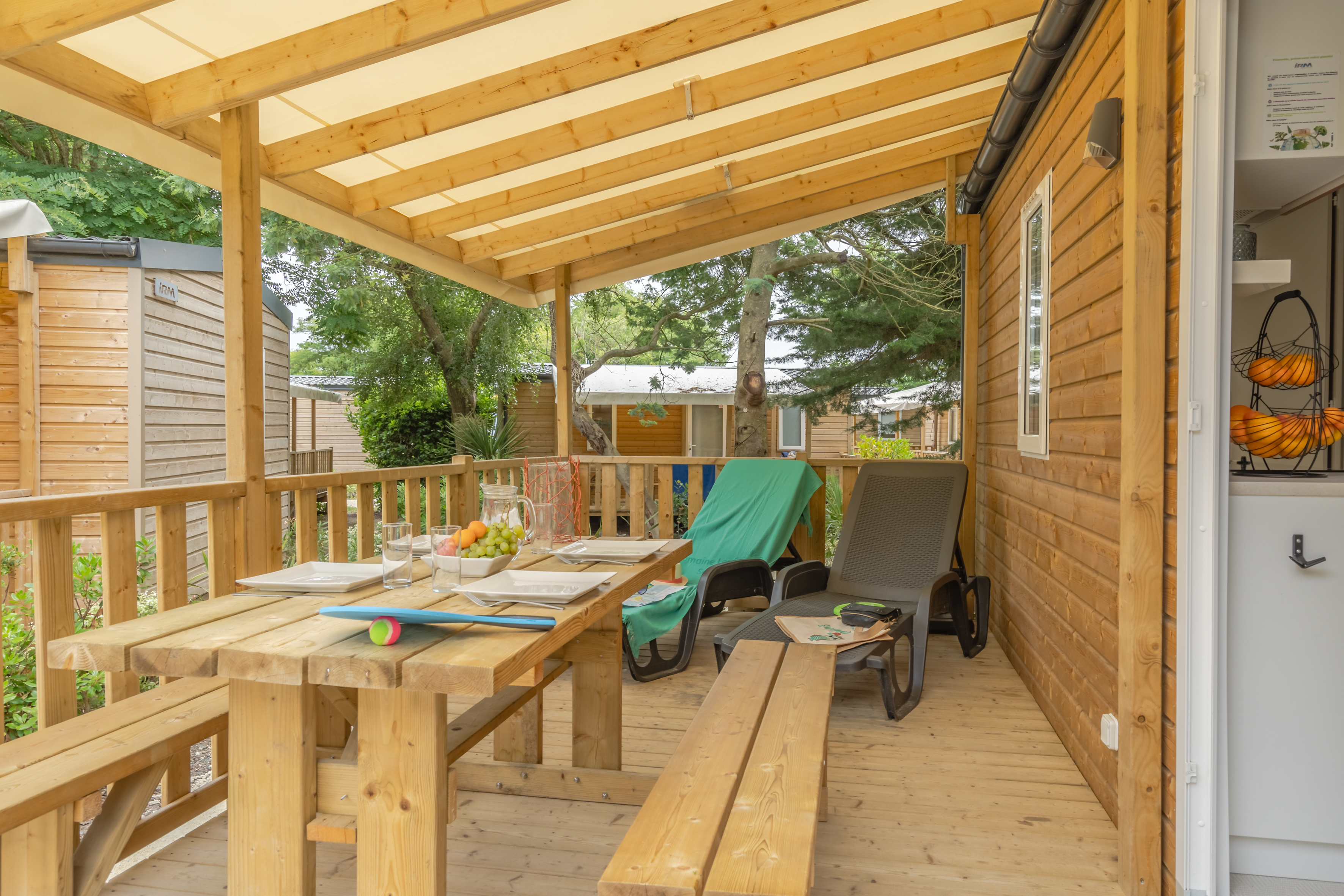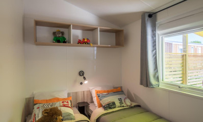 Slaapkamers: 1 slaapkamer met 1 tweepersoonsbed 140 x 190 cm. 1 slaapkamer met 2 eenpersoonsbedden 80 x 190 cm. Zitkamer: 1 x 120 x 190 cm 2-zits slaapbank. Dekbedden en kussens aanwezig. Lakens en handdoeken niet inbegrepen. Volledig ingerichte keuken met elektrische kookplaat, koelkast met vriesvak, afzuigkap, magnetron, espressomachine met capsule, citruspers, broodrooster, waterkoker, bestek, serviesgoed en keukengerei. Doucheruimte met douche en wastafel. Verwarming in alle kamers, water en elektriciteit inbegrepen. Televisie en 1 Wifi-aansluiting inbegrepen. Halfoverdekt houten terras van 15 m2 met tuinmeubilair waaronder 1 tafel, 2 banken en 2 ligstoelen. Aangelegd terrein. Niet-contractuele foto's